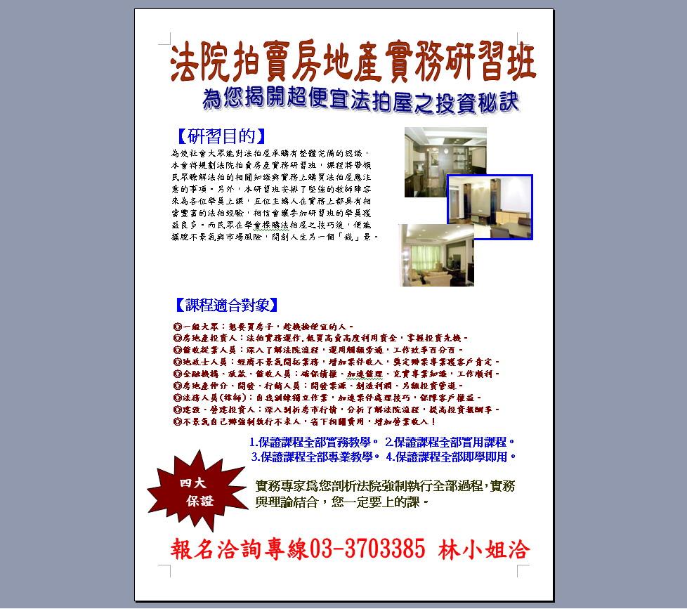 首頁/產業資訊訊息列表/桃園研習中心法拍實戰班 桃園研習中心法拍實戰班 桃園研習中心法拍實戰班 即日起開始受理報名 報名請洽:03-3703385 手機:0936030521 林小姐洽 詢價留言 您好,如有任何詢價需求,請善用這裡的【詢價留言】我們在收到您的留言時,會盡快處理及回覆! 詢價需求 需求說明 認證碼 同步成為台灣黃頁詢價供應商。 公司名稱統編 姓名電話 e-mail To: 催收協會 聯絡人:催** Email:b7******@pchome.com.tw 詢價回覆率:49% 送出詢價 https://0966189846.web66.com.tw/web/News?postId=1335772"90分鐘,向你展示最有效的網路賺錢系統,贏在集客力 "90分鐘,向你展示最有效的網路賺錢系統,贏在集客力