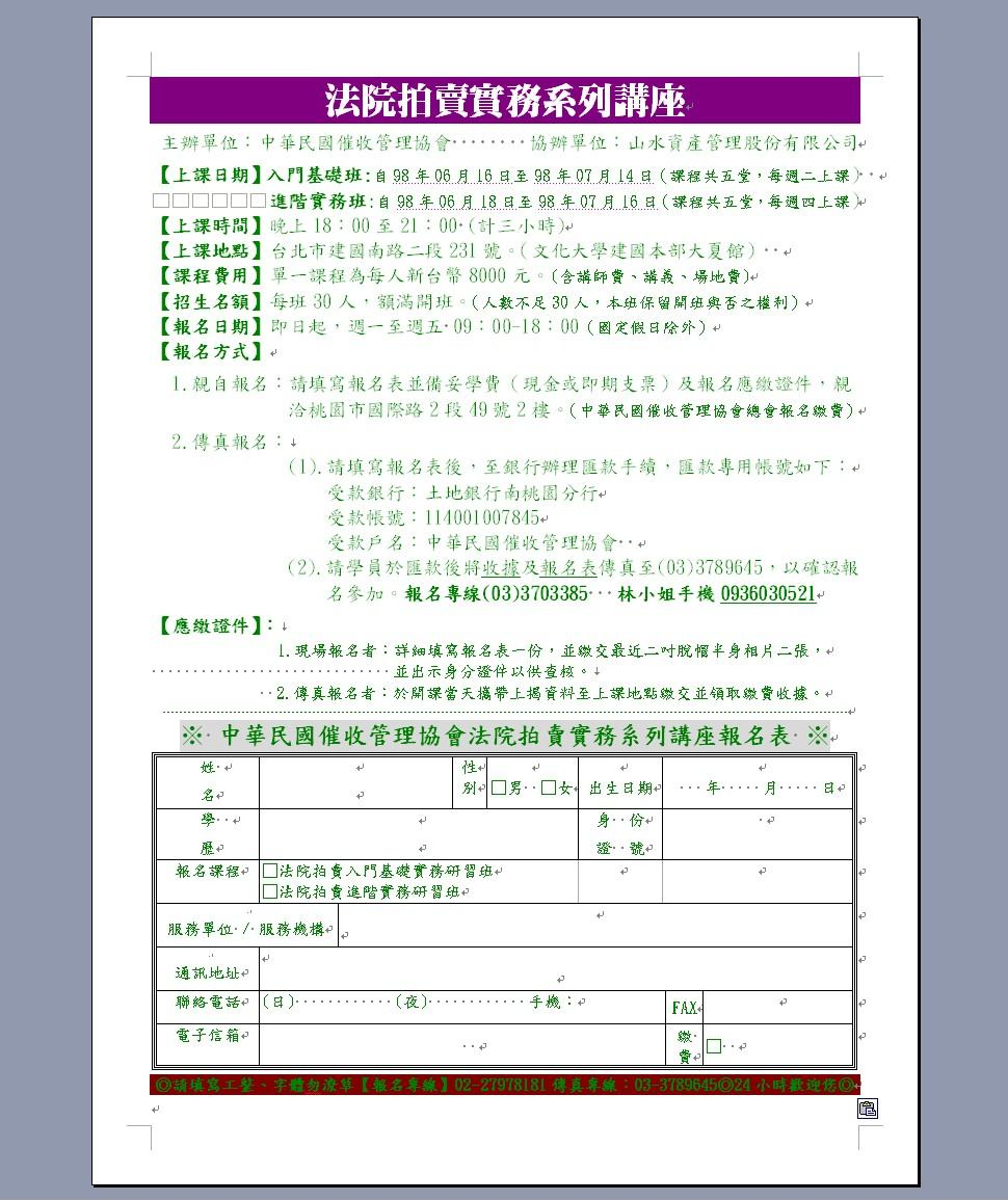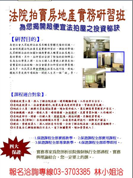 首頁/產業資訊訊息列表/台北法拍實務系列講座 台北法拍實務系列講座 台北法拍實務系列講座 歡迎洽詢:03-3703385,林小姐 詢價留言 您好,如有任何詢價需求,請善用這裡的【詢價留言】我們在收到您的留言時,會盡快處理及回覆! 詢價需求 需求說明 認證碼 同步成為台灣黃頁詢價供應商。 公司名稱統編 姓名電話 e-mail To: 催收協會 聯絡人:催** Email:b7******@pchome.com.tw 詢價回覆率:49% 送出詢價 https://0966189846.web66.com.tw/web/News?postId=1335771代書業界專業辦理 代書業界專業辦理